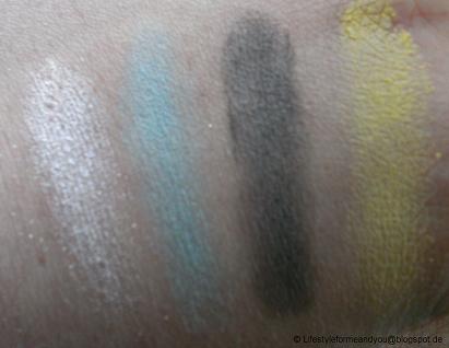 Hier seht ihr auch wieder eine kleine Palette mit 4 Lidschatten in. Der obere ist hier auch wieder glänzend und die anderen 3 sind wieder matt.